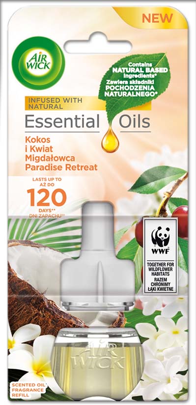 - Zapach Air Wick Kokos i Kwiat Migdałowca należy do kolekcji Essential Oils której kompozycje zapachowe zostały zainspirowane naturalnymi esencjami pochodzącymi z owoców, kwiatów i roślin, aby stworzyć wyjątkowy nastrój w Twoim domu.