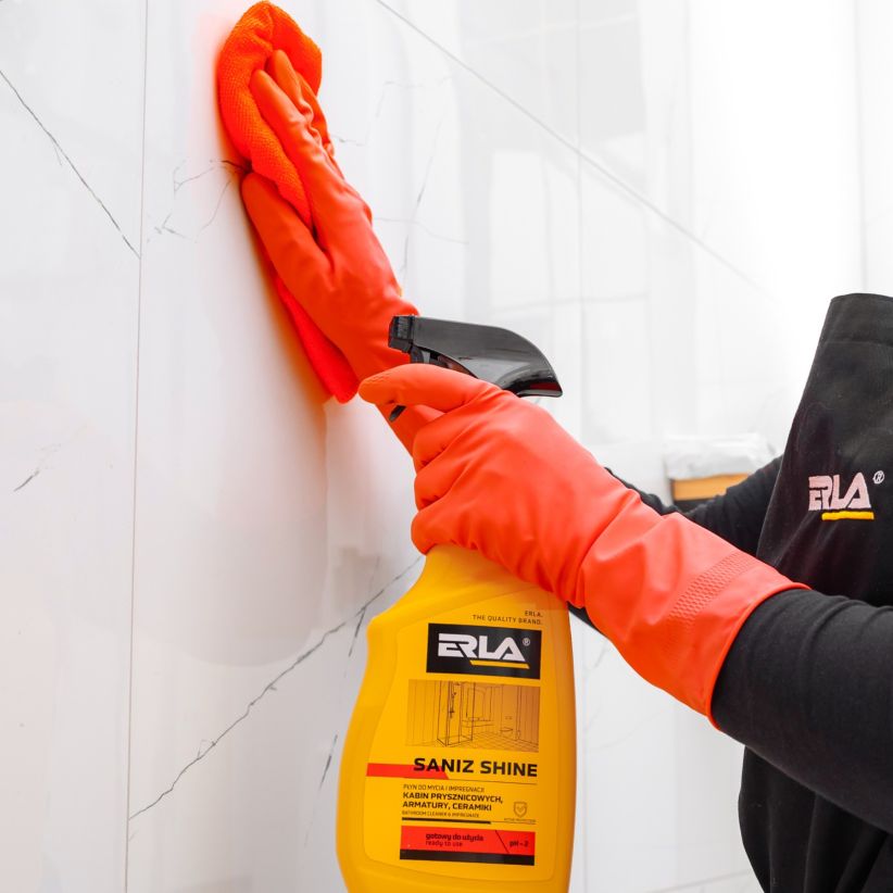Erla Saniz Shine to profesjonalny, gotowy do użycia środek do czyszczenia oraz impregnacji łazienek na bazie kwasku cytrynowego.