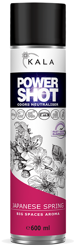 Neutralizator nieprzyjemnych zapachów, aromatyzer odświeżacz Kala POWER SHOT 600 ml to produkt z rewolucyjnym sposobem dozowania, dzięki któremu jedno naciśnięcie wentyla (ok. 1 sekunda) neutralizuje nieprzyjemne zapachy oraz aromatyzuje około 200 m3. W składzie POWER SHOT obecne są substancje czynne, dzięki którym nieprzyjemne zapachy są neutralizowane, a nie jak w przypadku większości odświeżaczy przykrywane. Wraz z neutralizacją nieprzyjemnych zapachów POWER SHOT zapewnia również aromatyzację przestrzeni jednym z dostępnych w gamie POWER SHOT zapachów.