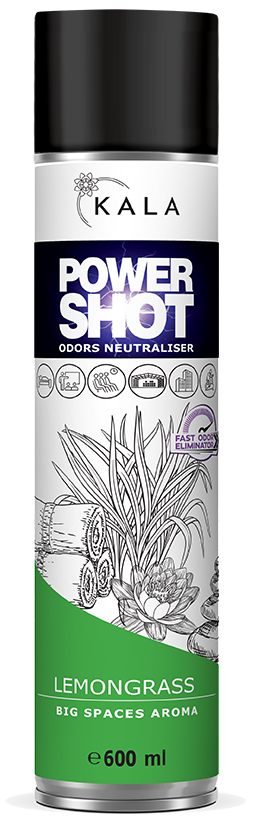 Neutralizator nieprzyjemnych zapachów, aromatyzer, odświeżacz Kala POWER SHOT zapach LEMON GRASS 600 ml to cudowny orzeźwiający cytrusowy zapach, który pobudzi zarówno Twoje ciało jak i umysł. Zapach, dzięki któremu wymiernie odczujesz wzrost energii.