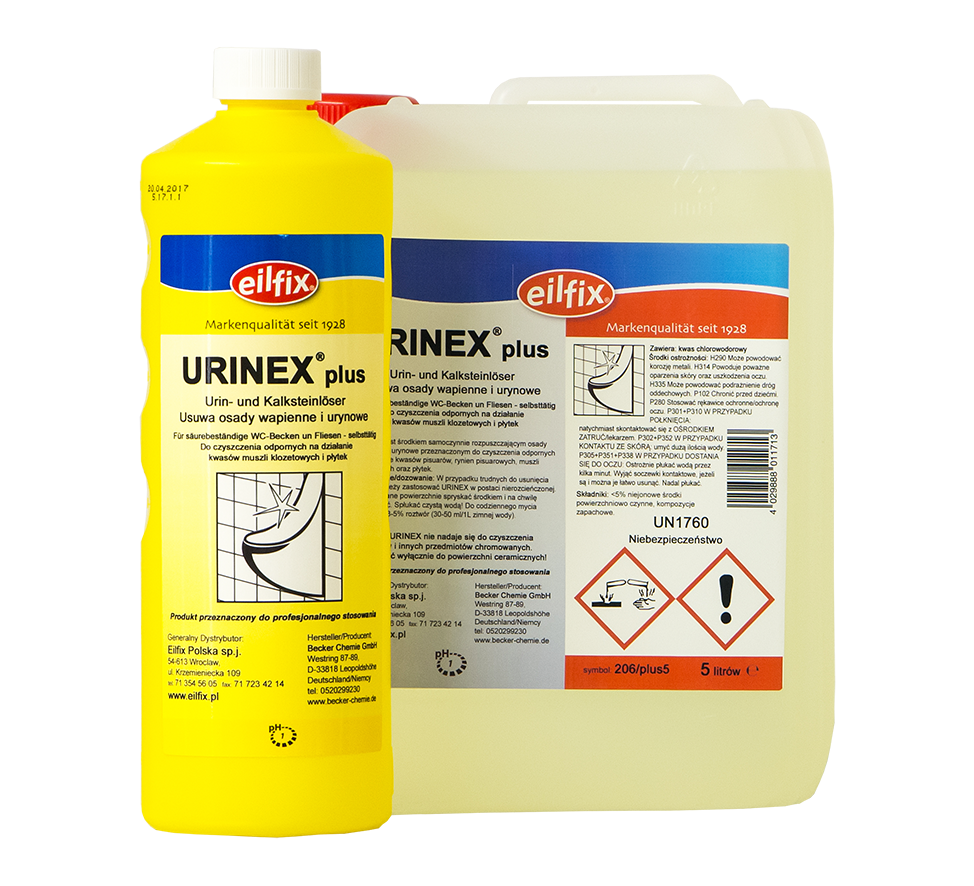 EILFIX Urinex Plus usuwa osady wapienne i urynowe. Przeznaczony do czyszczenia odpornych na działanie kwasów muszli klozetowych i płytek. URINEX jest środkiem samoczynnie rozpuszczającym osady wapienne i urynowe przeznaczonym do czyszczenia odpornych na działanie kwasów pisuarów, rynien pisuarowych, muszli klozetowych oraz płytek.