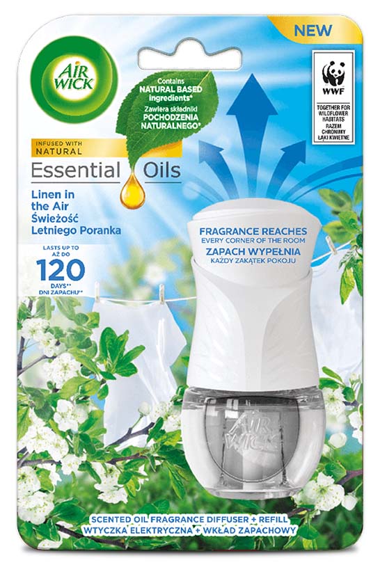 Elektryczny odświeżacz powietrza Air Wick to świeżość letniego poranka w Twoim domu. Kiedy tylko chcesz – przez cały dzień i cały rok. W zestawie znajdziesz wszystko, czego do tego potrzebujesz. Naturalne olejki eteryczne gwarantują intensywność zapachu, a możliwość regulacji pozwala na wypełnienie domu świeżością nawet do 120 dni.