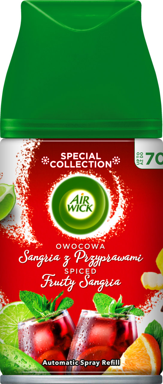Air Wick Freshmatic Owocowa Sangria z Przyprawami to zapasowy wkład zapachowy do automatycznych urządzeń Air Wick Freshmatic. Zapach łączy słodkie nuty soczystych owoców z aromatem korzennych przypraw i subtelną nutą czerwonego wina, tworząc ciepłą, przytulną atmosferę – jak letni wieczór w hiszpańskim klimacie. Dzięki olejkom eterycznym kompozycja jest intensywna, a regulacja urządzenia pozwala dopasować moc zapachu do wielkości pomieszczenia.