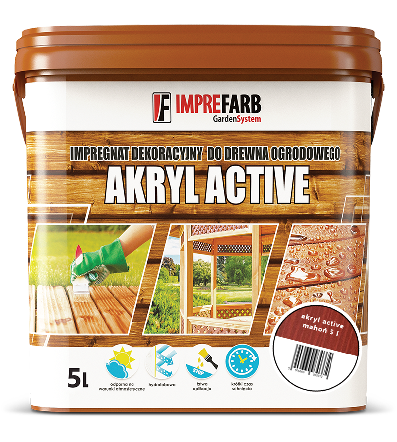 Środek do impregnacji i pielęgnacji drewna ACRYL ACTIV przeznaczony jest do zabezpieczenia i dekoracji drewna, do zastosowania zarówno wewnętrznego i zewnętrznego. Produkt zapewnia efekt „odpychania wody” dzięki wysokiej jakości woskom. Środek do impregnacji i pielęgnacji drewna AKRYL ACTIVE charakteryzuje się trwałą powłoką, odporną na promieniowanie UV. Środek znajduje zastosowanie do każdego rodzaju drewna, także drewna ogrodowego (altan, pergoli itp.).