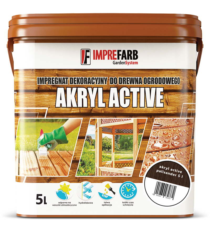 Środek do impregnacji i pielęgnacji drewna ACRYL ACTIV przeznaczony jest do zabezpieczenia i dekoracji drewna, do zastosowania zarówno wewnętrznego i zewnętrznego. Produkt zapewnia efekt „odpychania wody” dzięki wysokiej jakości woskom. Środek do impregnacji i pielęgnacji drewna AKRYL ACTIVE charakteryzuje się trwałą powłoką, odporną na promieniowanie UV. Środek znajduje zastosowanie do każdego rodzaju drewna, także drewna ogrodowego (altan, pergoli itp.).