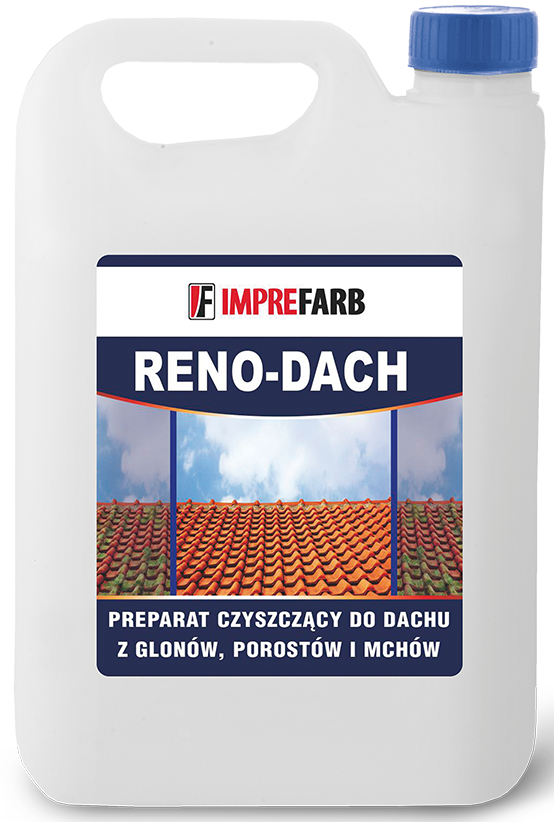 Imprefarb RENO-DACH 5L to skuteczny preparat biologiczny przeznaczony do usuwania glonów, porostów oraz mchów z powierzchni dachowych. Produkt przywraca naturalny kolor pokrycia dachowego, a jednocześnie wspiera ochronę dachu przed ponownym pojawieniem się nalotów nawet przez 3 lata (w zależności od warunków otoczenia).