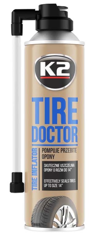 K2 Tire Doktor szybko i skutecznie pompuje i uszczelnia przebite opony - tymczasowa naprawa bez demontażu i użycia narzędzi. Aerozol pompuje oponę, a specjalna lateksowa formuła uszczelnia dziurę. Preparat nie wpływa na wyważenie koła. Pompuje większość opon, aż do rozmiaru 235/70-16.