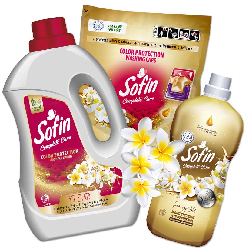 Sofin Complete Care płyn do płukania 1,4L płyn do prania 1,5L kapsułki 24 szt. ZESTAW