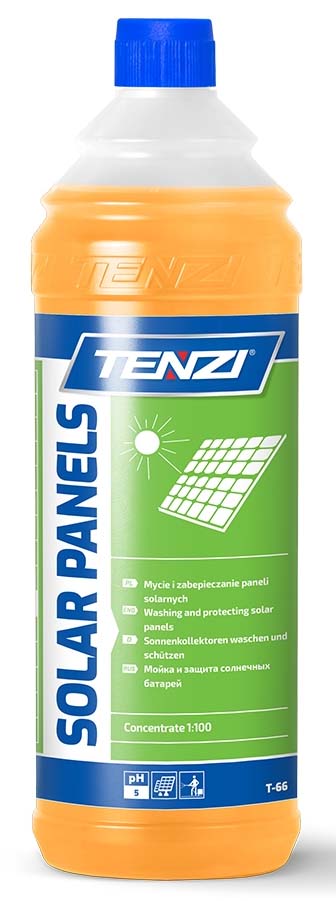 Lekko kwaśny produkt w koncentracie do mycia paneli solarnych wraz z ich zabezpieczeniem przed ponownym osadzaniem się pyłów. Usuwa brud eksploatacyjny (sadza, kurz, pył) oraz mineralny (nacieki i osady wodne, atmosferyczne). Tworzy zabezpieczającą hydrofobową powłokę ochronną spowalniając tym samym proces ponownego brudzenia. Biodegradowalny. Przepuszczalność promieni słonecznych 100%.