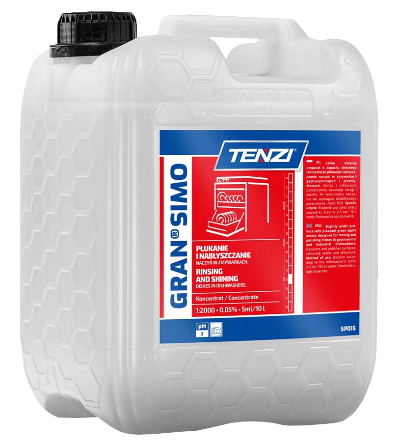 ✔️ TENZI Gran Simo to profesjonalny nabłyszczacz przeznaczony do stosowania w zmywarkach gastronomicznych oraz przemysłowych. Dzięki zastosowaniu kwaśnego odczynu i składników powierzchniowo czynnych skutecznie usuwa osady i pozostałości po detergentach.